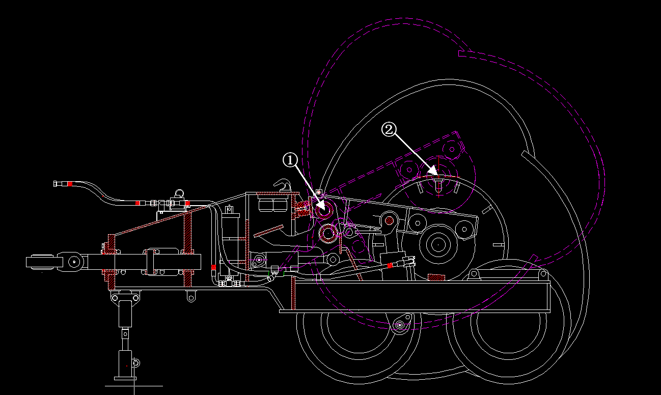 通過沖擊式壓路機設計圖紙(上圖),可以看到,當沖擊壓實輪向上舉起時,整個大輪包括軸管(千斤頂?shù)闹雾旤c)都是沿著一個弧度方向上升的(見圖2),加上千斤頂?shù)闹雾旤c(軸管)與千斤頂頂頭的接觸面很小,很容易滑脫,造成重大事故!